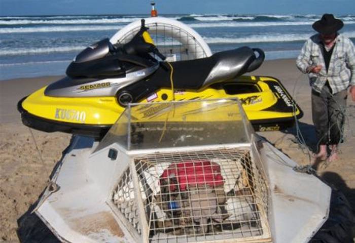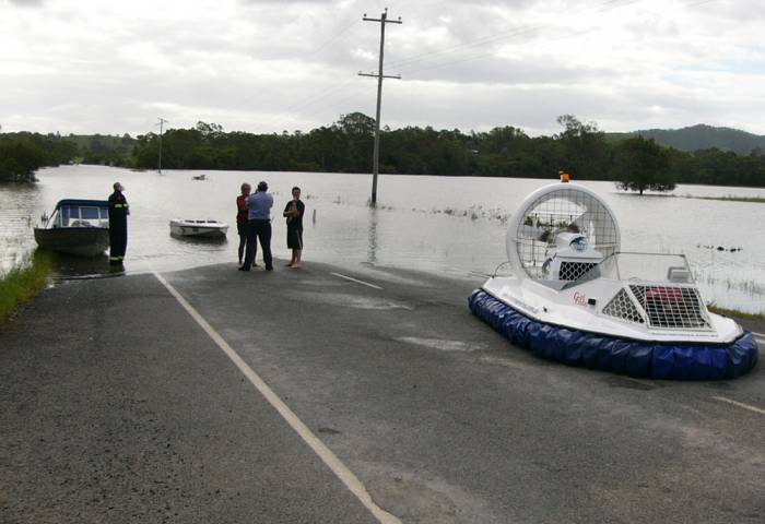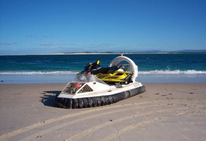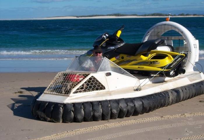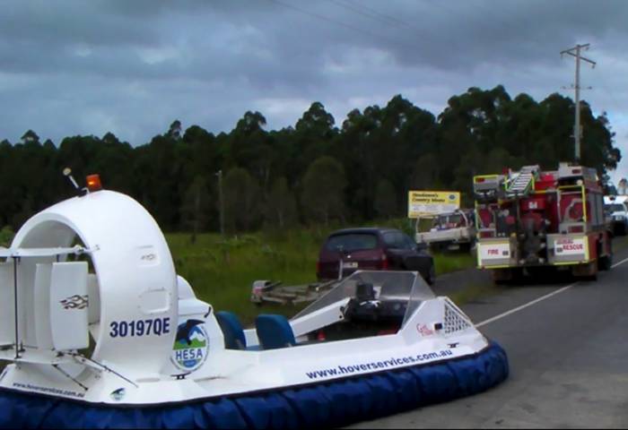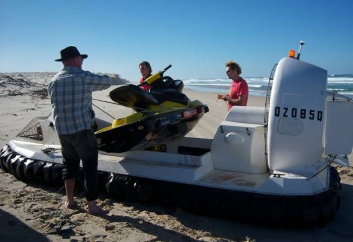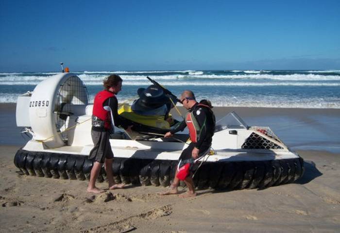 Jetski swamped in the surf is loaded onto the hovercraft for a ride back to calmer waters