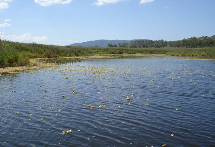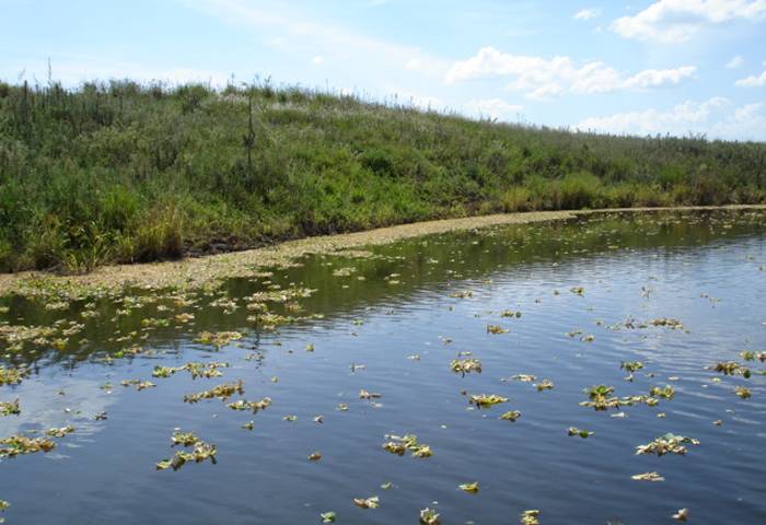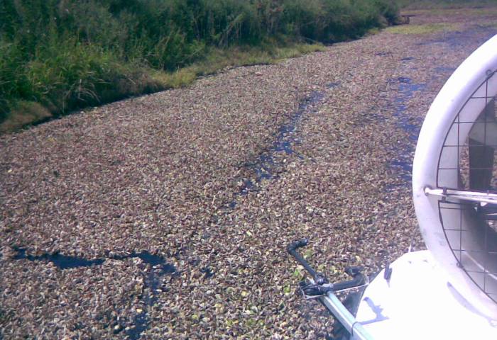 Vast areas of weed hides metres of water, logs and rocks